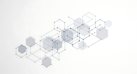 Polygonal molecular structures with glowing nodes are prominently displayed against a textured dark blue backdrop, evoking a sense of advanced technology and science