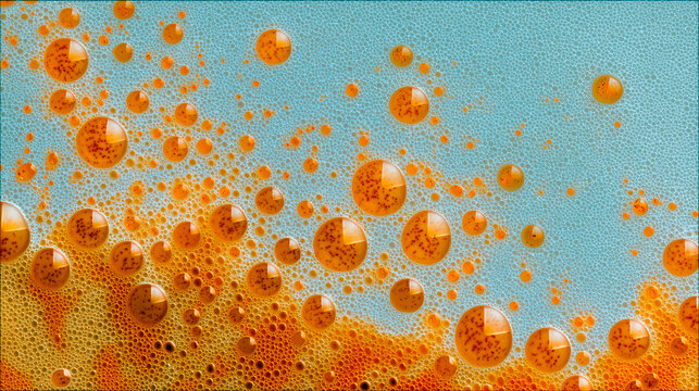 Close-up abstract macro of oil droplets with spices suspended in water against blue background, forming colorful and dynamic liquid texture