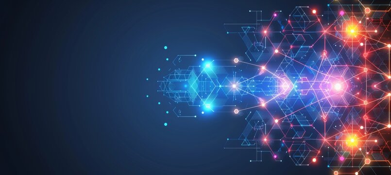 Polygonal shapes and futuristic molecules on dark blue background, digital vector design concept.