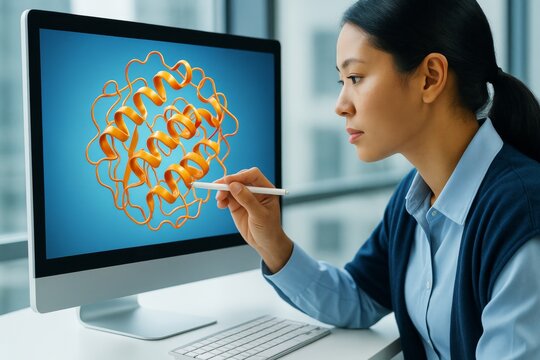 Female scientist analyzing 3D molecular structure on computer screen using stylus in modern lab with science concept and abstract light background. Ai generative