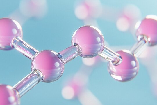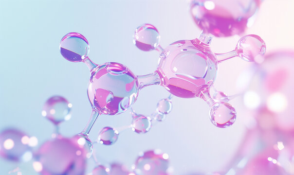 molecules on pink blue background. Abstract molecule model. Scientific research in molecular chemistry. Collagen Skin Serum, hyaluronic acid, peptides cosmetics skin care cosmetics solution
