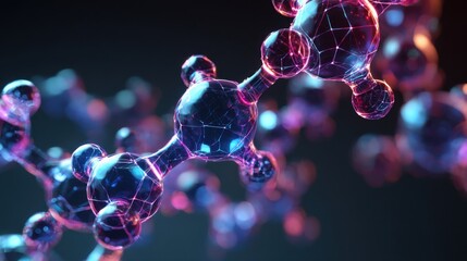 Bright molecular structure with shiny pink and blue spheres, symbolizing interconnectedness in a modern scientific concept.