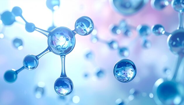 Futuristic molecular model with glossy blue atoms and rods on a soft abstract background.