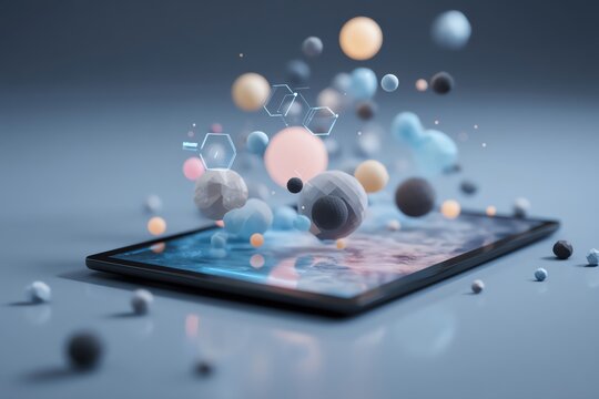 A digital tablet displaying an array of colorful abstract molecules, symbolizing innovation and scientific progress.