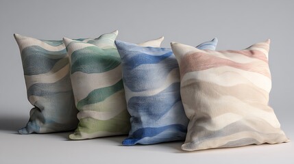 Multicolored wave pattern throw pillows in shades of blue, green, beige on gray background, home decor textiles