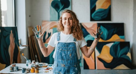 Young caucasian female artist smiling in studio with abstract paintings