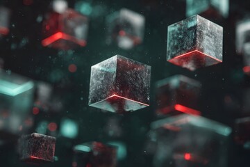 Abstract 3d floating glass cubes with red and teal neon light, futuristic blockchain data technology background