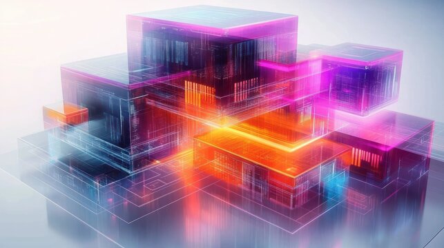Abstract digital scene with glowing floating translucent squares and rectangles in blue, orange, and red hues creating a futuristic technological atmosphere