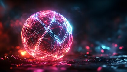 Abstract geometric sphere with interconnected lines over neon light streaks