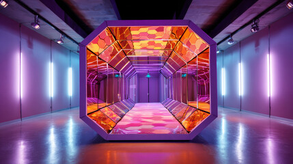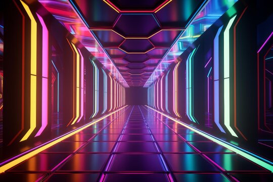 Futuristic neon tunnel with vivid colors and geometric patterns