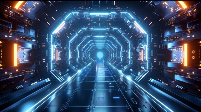 Bright blue neon tunnel features complex hexagonal pattern. Futuristic data pathway provides fast connection to tech innovation. Represents advanced cyber travel, digital journey into unknown future.