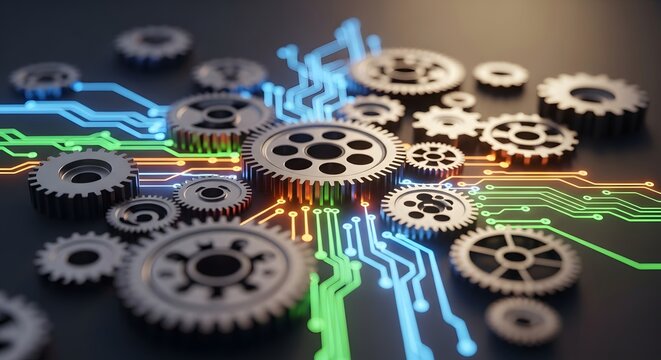 Mechanical Gears and Glowing Digital Circuitry on Dark Background: Engineering, Technology, and Automation Concept