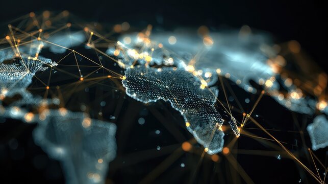 A world map designed with glowing connections highlights the global network of digital technology, ideal for illustrating business and internet concepts