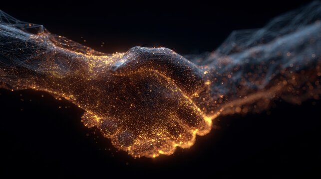 Digitally rendered handshake, composed of glowing particles. Dark background highlights the futuristic technology theme. Represents collaboration, agreement, and partnership