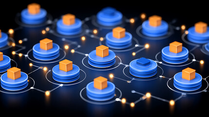 Abstract digital network of glowing blue and orange nodes connected by thin lines on a dark background, representing data flow and connectivity