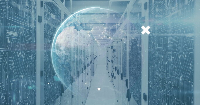 Digital interfaces and holographic globe floating in server room