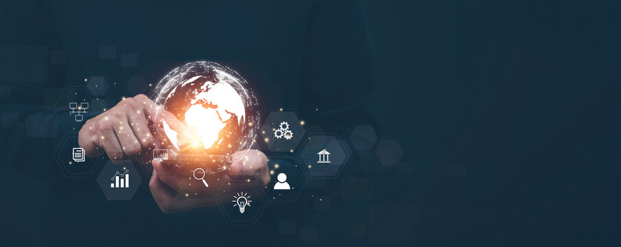 Businessman holding a glowing digital sphere with team members and business icons in a futuristic setting