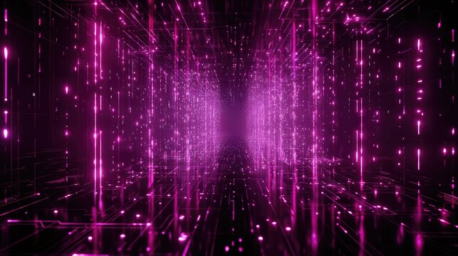 Futuristic digital tunnel with glowing neon lights and abstract network