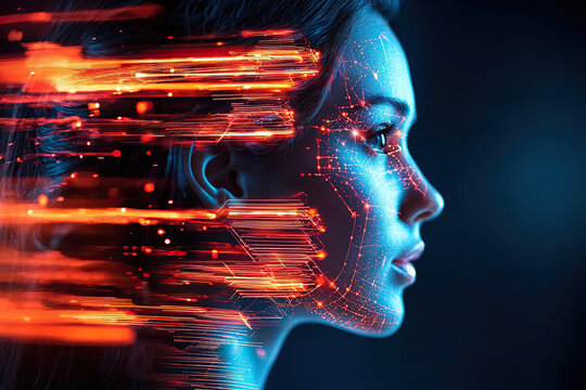 Futuristic abstract representation of woman profile with digital elements and vibrant colors