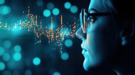 Woman gazes at futuristic digital data with glowing blue light effects