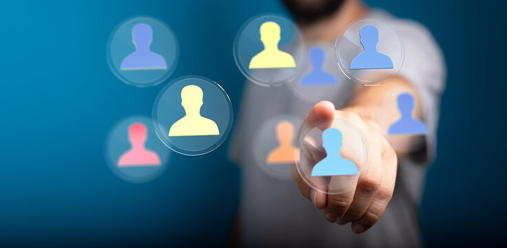 Hand pressing person icon. HR, business people or contact choices. Modern technology or teamwork ideas. Social network abstract with blue backgr
