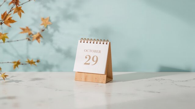 Close-up of a daily calendar marking October 29 on a white reflective table with a soft blue background, seasonal autumn setting with room for text