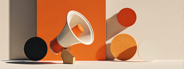 Megaphone on a wooden stand, vibrant orange textured background, abstract circular shapes. perfect for marketing, promotion, and public announcements in business.