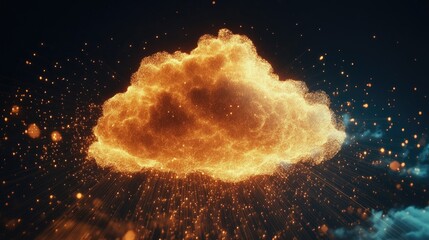 Abstract, glowing cloud icon illuminated with digital particles, set against a dark background