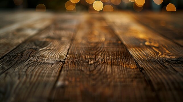 A close-up shot of an empty rustic wooden table with a soft, blurred background of abstract bokeh lights