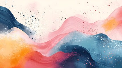 Abstract watercolor painting featuring flowing curves of blue pink orange and white with splattered accents
