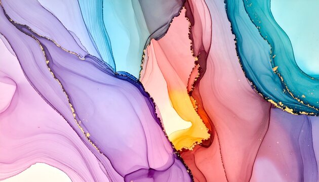 Fluid abstract with vibrant watercolor hues and gold accents, resembling smoke or clouds