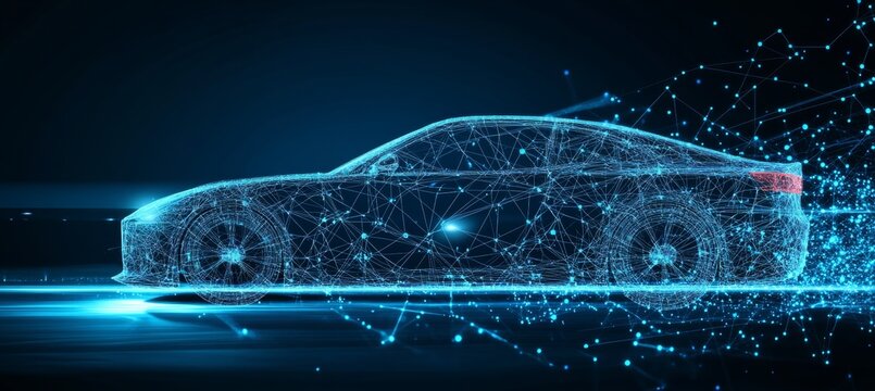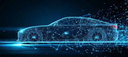 Abstract Technology Car, Futuristic Automobile Icon Connected with Dots, Lines, Triangles on Blue