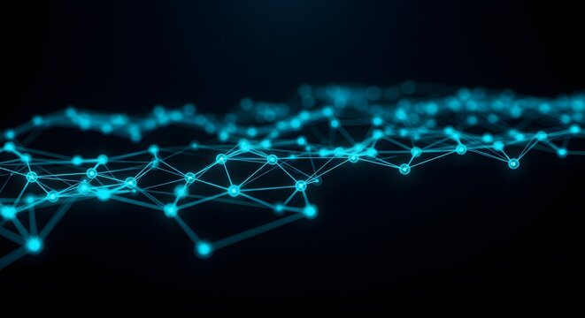 A glowing blue network of interconnected nodes and lines against a dark black background design element