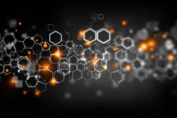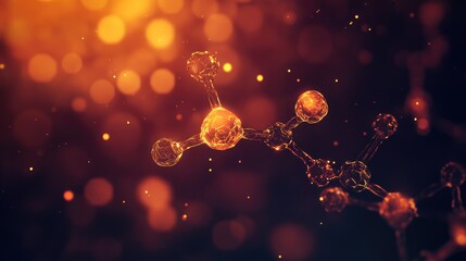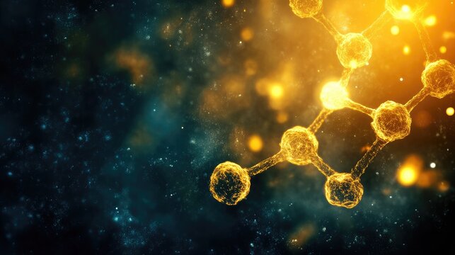 Molecular Network: A sophisticated molecular network, illuminated by warm, glowing energy, unfolds against a dark, textured backdrop, conveying the intricate structure of science and technology.