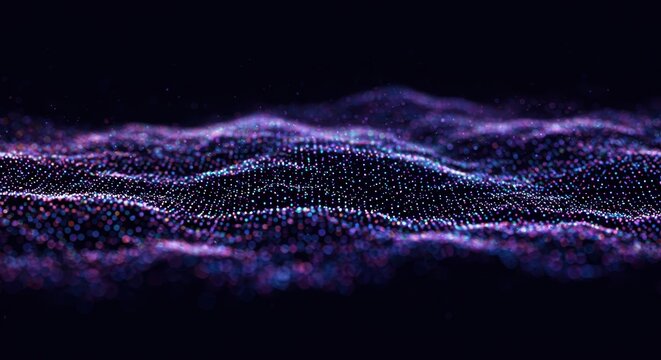 Glowing digital particles form a complex, undulating wave pattern against a dark background