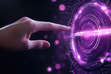 A futuristic hand reaching towards a glowing purple circle, symbolizing technology and interaction with digital realms.