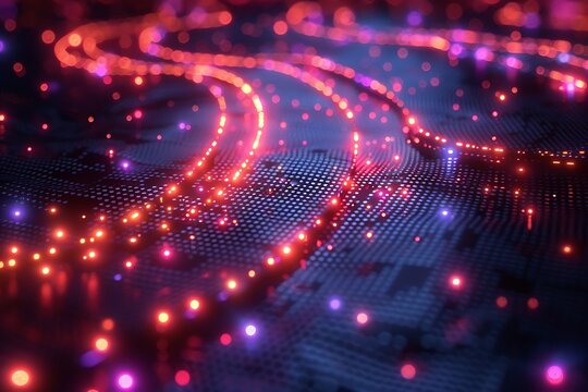 Abstract digital waves forming a network of luminous particles, representing data flow, connectivity, and technological innovation in a vibrant landscape
