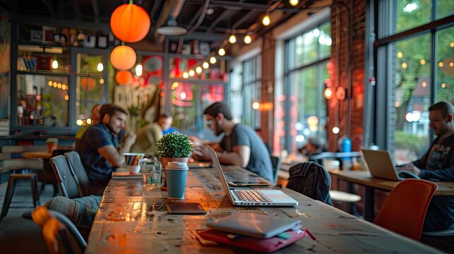 A vibrant photo of a coding meet-up in a cafe, with developers sharing insights and coding on their laptops.