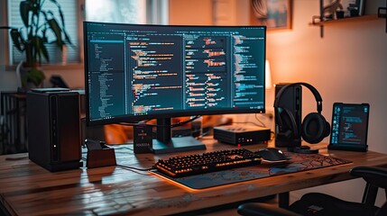 A professional coder's workspace with ergonomic equipment, dual monitors, and a clean, organized desk.