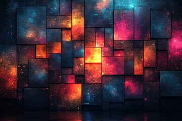 Abstract colorful mosaic wall art.  Glowing rectangular panels create a dynamic, textured background.