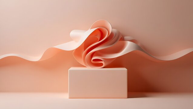 Elegant soft peach and blush abstract sculpture gracefully flowing over a minimalist rectangular display pedestal, set in a serene monochromatic studio.