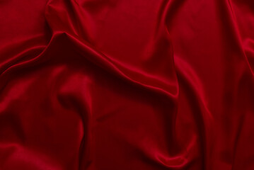 The top view of the red satin surface looks luxurious and beautiful. with sparkling waves Abstract background design copy space Card or banner (blurred or blurry)