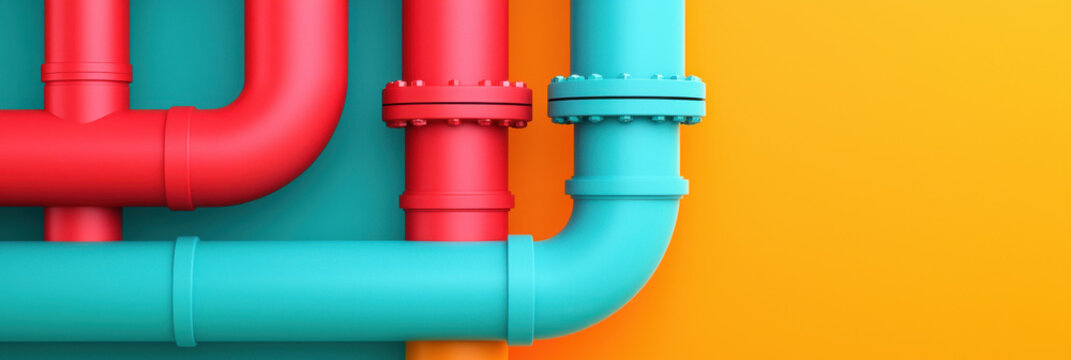 Colorful pipes in red and turquoise against bright yellow background create vibrant industrial aesthetic. arrangement showcases modern design elements and playful color contrasts