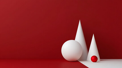 Minimalist still life with a red backdrop, featuring white spheres and cones, plus a small red sphere, creating an elegant composition. Modern aesthetic, simplicity.