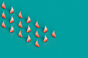 Four sailing yachts gliding over coral reefs in turquoise tropical lagoon at golden hour