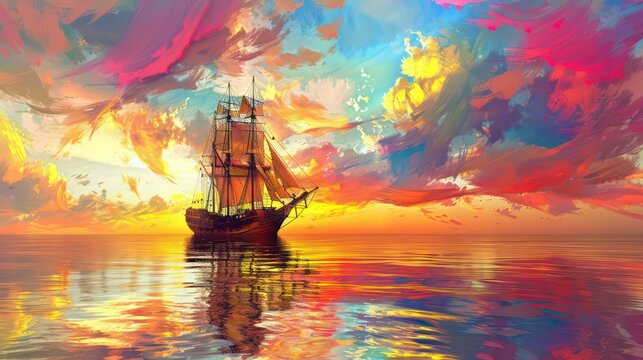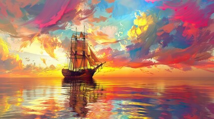 Vintage wooden sailing pirate ship at sea during dramatic sunset