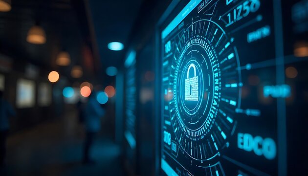 A digitally rendered display of a padlock icon overlaid on a complex circular interface, symbolizing data security