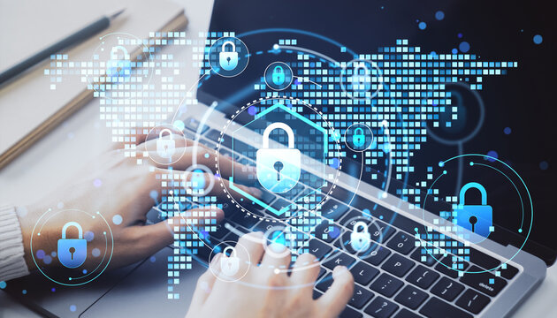 Hands typing on laptop with glowing digital security lock overlay