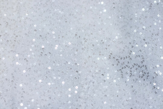 Close-up of Glimmering Silver Sequin Fabric Texture with Reflective Ambient Light