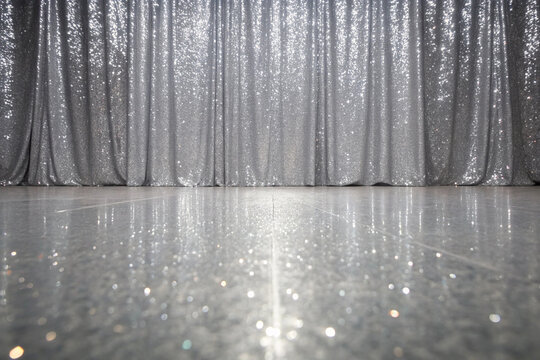 Silver Sequin Curtain and Sparkling Floor with Bokeh Lights sequins fabric Birthday Background